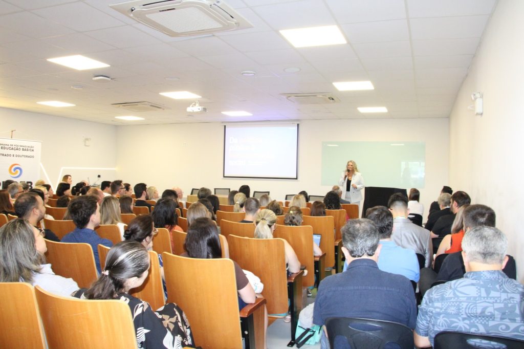Valeska Tratsk dialogou com mestrandos e doutorandos das áreas de Desenvolvimento e Sociedade e Educação Básica da Uniarp. (Fotos: Ângela Cardoso/Comunicação Uniarp)
