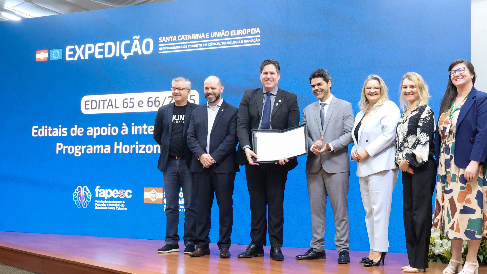 A internacionalização foi um dos eixos estratégicos da atuação da Fapesc em 2025, fortalecendo a inserção de Santa Catarina em redes globais de ciência, tecnologia e inovação. Ao longo do ano, a Fundação lançou voltados à cooperação internacional, mobilidade acadêmica e acesso a grandes programas globais de fomento, conectando pesquisadores, instituições e empresas catarinenses a centros de excelência no exterior. Como exemplos, os editais 65/2025 e 66/2025, com investimentos de R$ 10,5 milhões, para conectar empresas e pesquisas catarinenses ao maior programa de fomento do mundo, o Horizonte Europa.